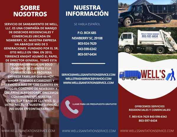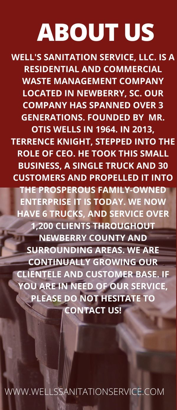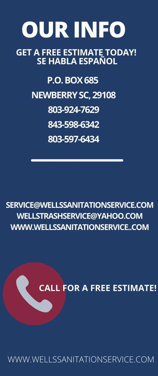 Mailing Address: P.O. Box 685 Newberry SC, 29108 Office & Sales: (803)924-7629 Email: service@wellssanitationservice.com or wellstrashservice@yahoo.com