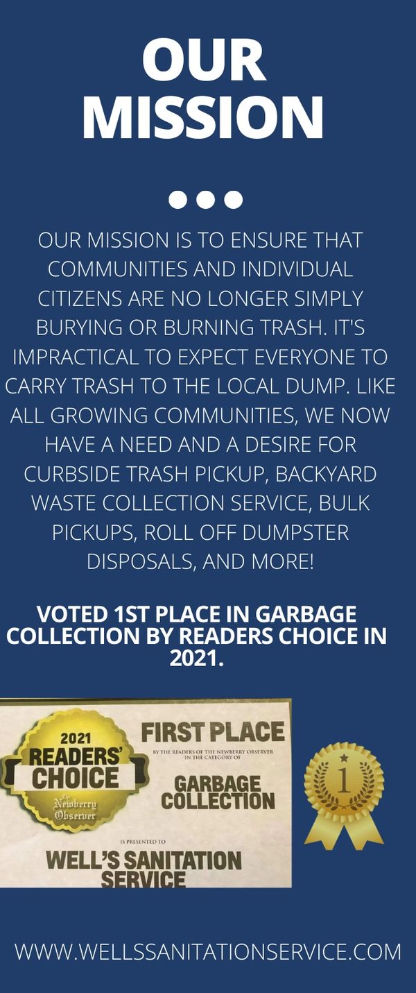 Well’s Sanitation Service provides waste disposal & roll off service to residential and commercial customers throughout the state of South Carolina. We are a family own business and we take pride in providing world class service. We have been in the waste management industry for over 70 years.